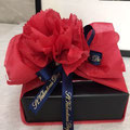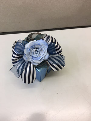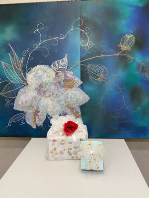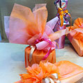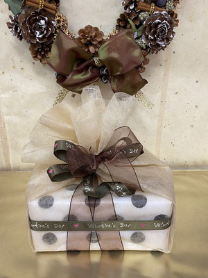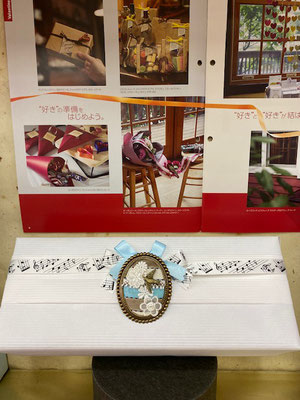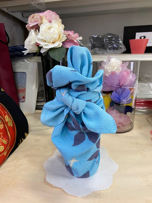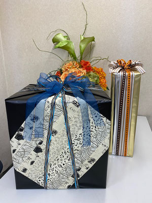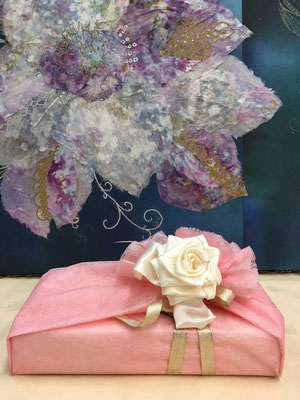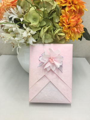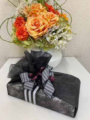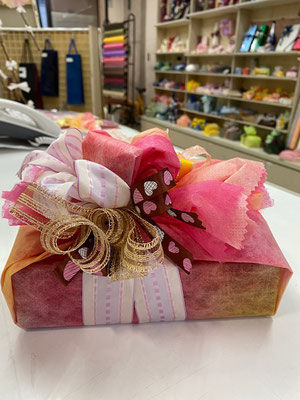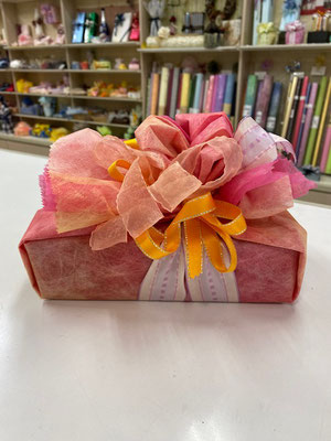 早速、リボンやペーパーフラワーを加えて、映える風呂敷ラッピングをつくってみました。